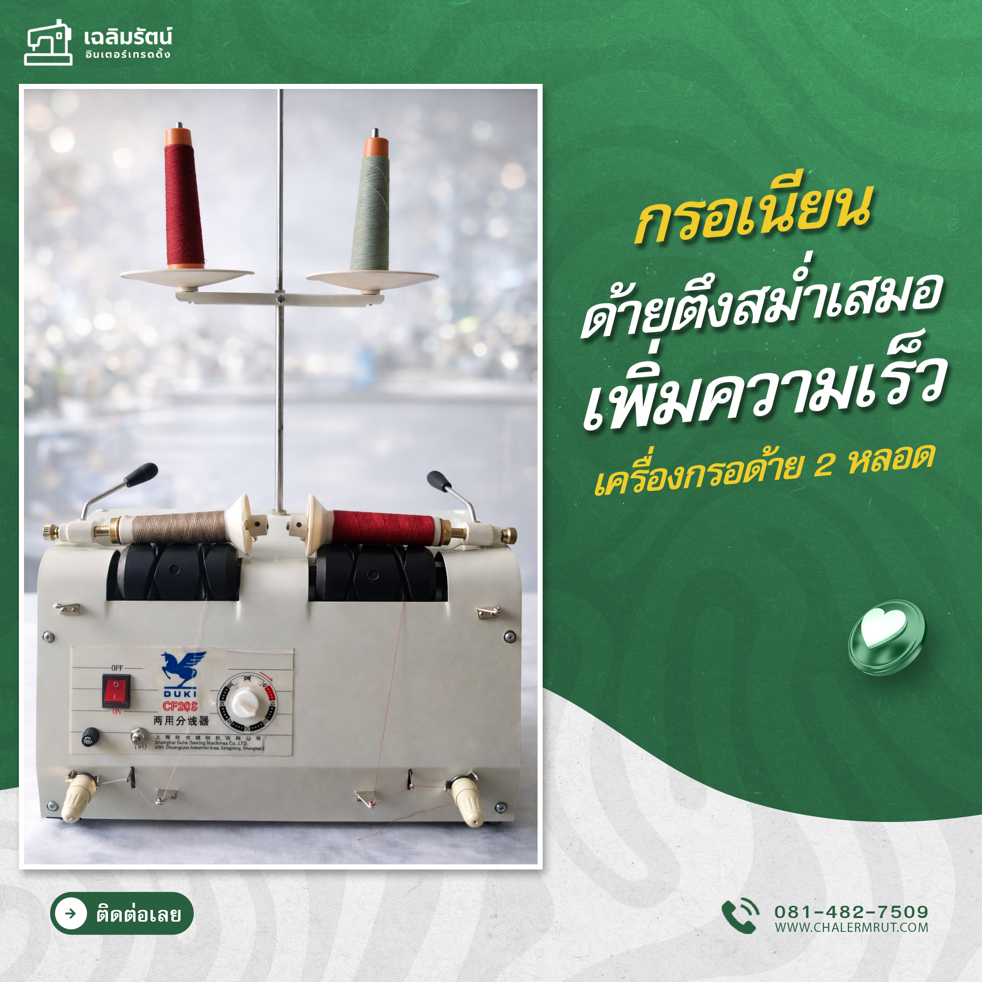 เครื่องกรอด้ายคุณภาพสูง ขนาด 2 หลอด มาพร้อมแกนขนาด 4 นิ้ว ออกแบบมาเพื่อใช้งานง่าย สะดวก และเพิ่มประสิทธิภาพในการแบ่งด้ายจากหลอดใหญ่อย่างมืออาชีพ